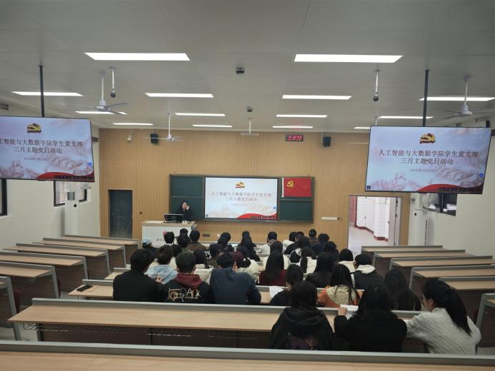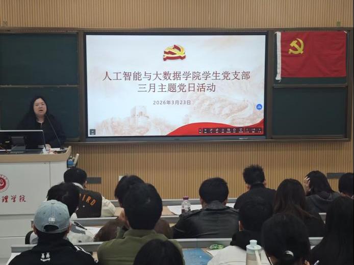2026年3月23日上午,人工智能与大数据学院学生党支部在弘致楼111教室组织开展了支部三月主题党日活动。本次活动由学生党支部书记李林主持,紧扣全党树立和践行正确政绩观学习教育要求,融合理论学习与交流研讨,既引导全体党员深刻领会全国两会精神,也围绕“十五五”规划展开热烈讨论,推动正确政绩观在青年党员中入脑入心,切实把学习教育成果转化为奋进实干的动力。