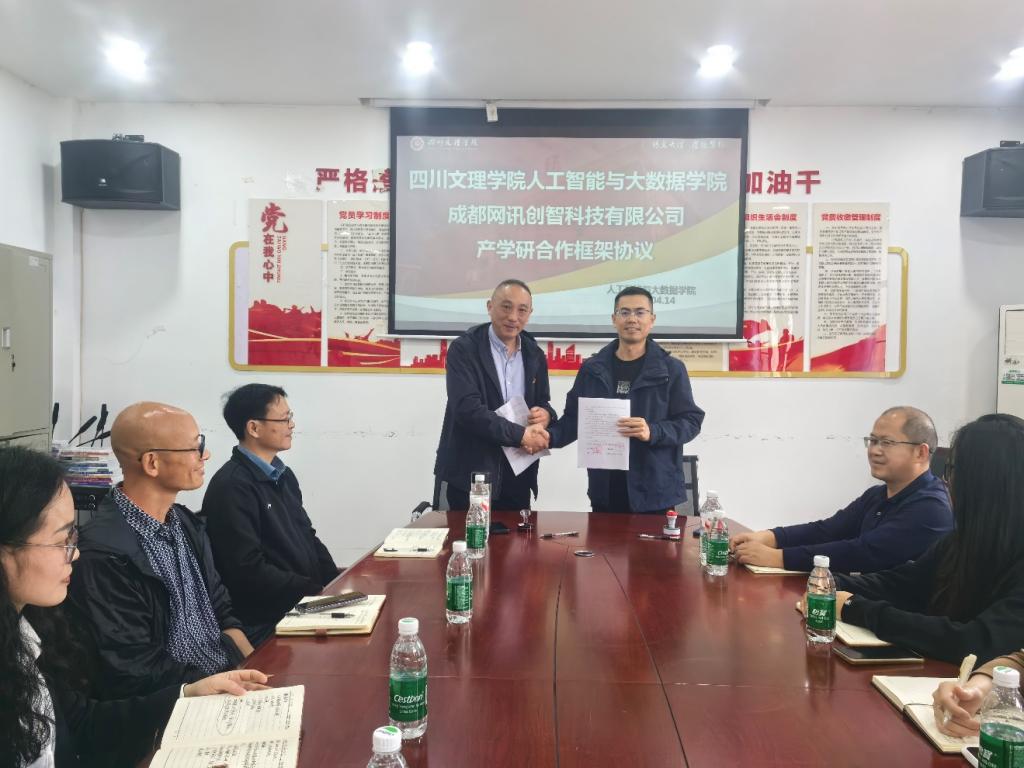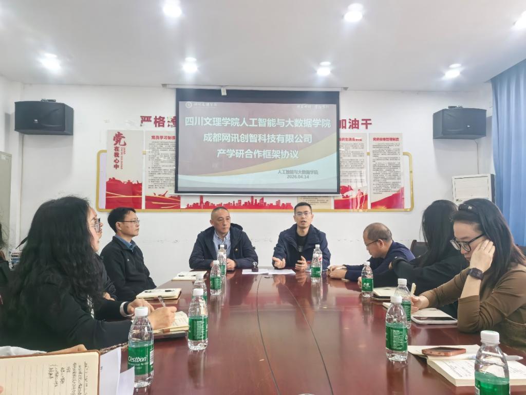 2026年4月14日,四川文理学院人工智能与大数据学院与成都网讯创智科技有限公司战略合作签约仪式在达州顺利举行。四川文理学院人工智能与大数据学院院长杨成福、成都网讯创智科技有限公司总经理杨宇代表双方签署协议。双方将在人工智能人才培养、技术创新研发、成果转化等领域开展全方位合作,共同探索校企协同育人的新模式。