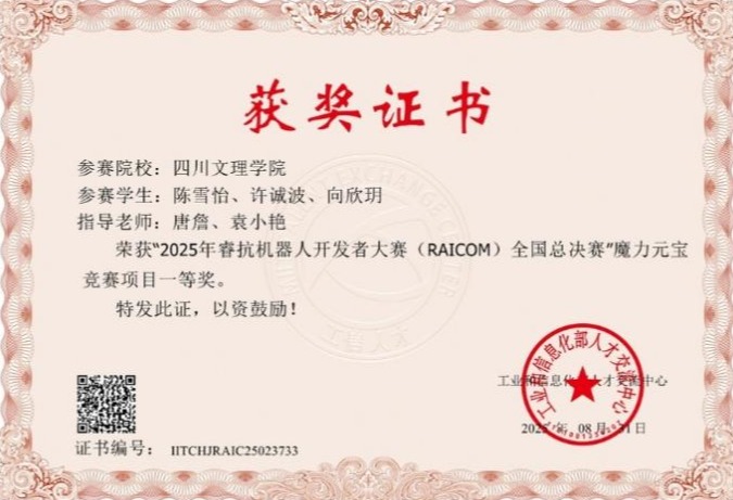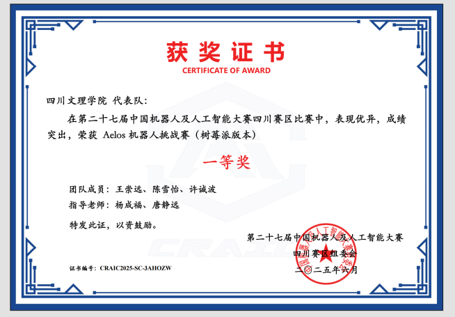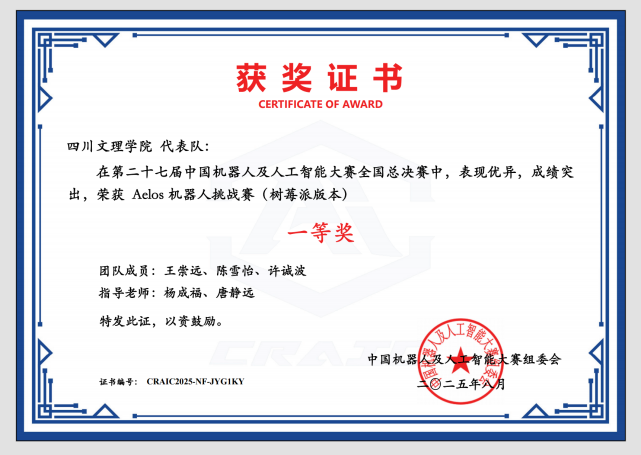 在第二十七届中国机器人及人工智能大赛中,我院代表队表现尤为突出。由杨成福、唐静远老师指导,王崇远、陈雪怡、许诚波三位同学组成的团队凭借卓越的综合能力,先后荣获四川赛区一等奖和全国总决赛一等奖,成为省级、国家级双料冠军;幸彩霞、甯婷婷、王静团队荣获全国总决赛三等奖。此外,多支队伍在省赛中表现优异:张兴宇、杨雅晰、刘发敏团队获省级二等奖;胡谍、周志华、王森民团队,阙嘉、殷黎、付帅旗团队,谢义锋、徐国瑞、杨浩云团队和张庭兵、刘乾、熊浩团队均获省级三等奖。