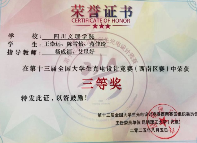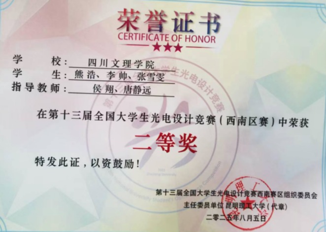 在第十三届全国大学生光电设计竞赛西南区赛中,我院学子同样表现亮眼。由侯翔、唐静远老师指导,熊浩、李帅、张雪雯组成的团队凭借“智能车激光对抗系统”的创新设计荣获赛区二等奖。该作品通过光电传感技术与智能控制算法的创新融合,实现了复杂环境下的精准识别与快速响应。此外,由杨成福、艾星好老师指导的王崇远、陈雪怡、蒋佳玲团队,以及唐静远、吴军老师指导的杨柳、张庭兵、郭雨祥团队分获三等奖。该竞赛由中国光学学会主办,同样被纳入全国高校学科竞赛排行榜,侧重光电技术与智能控制等方向的工程实践与创新能力。