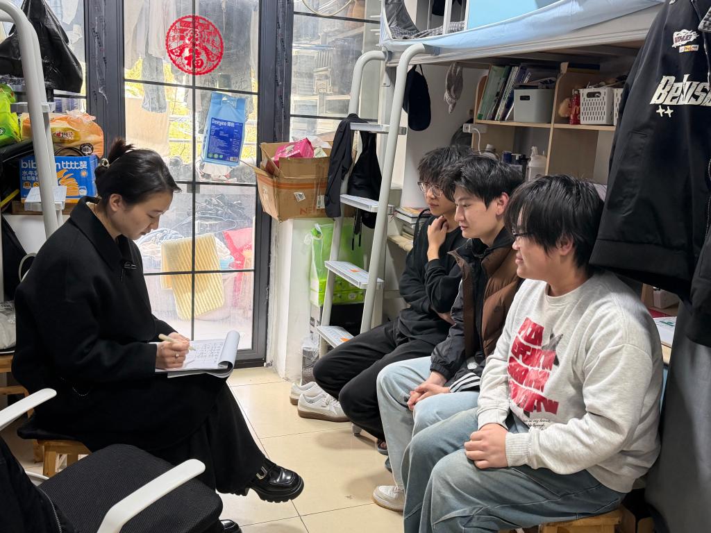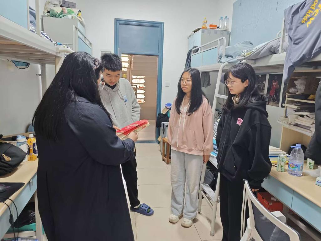 辅导员李林老师带领班级主要学生干部走进2023级11-13班学生宿舍。走访中,李老师与同学们共同学习了习近平总书记在全国两会期间的重要讲话精神,引导大家将个人成长融入国家发展大局。她仔细检查各寝室用电安全情况,排查人走不断电、飞线充电等安全隐患,督促同学们严格落实晚归、夜不归宿报告制度,并提醒大家关注春季心理健康,遇情绪困扰及时寻求专业帮助。